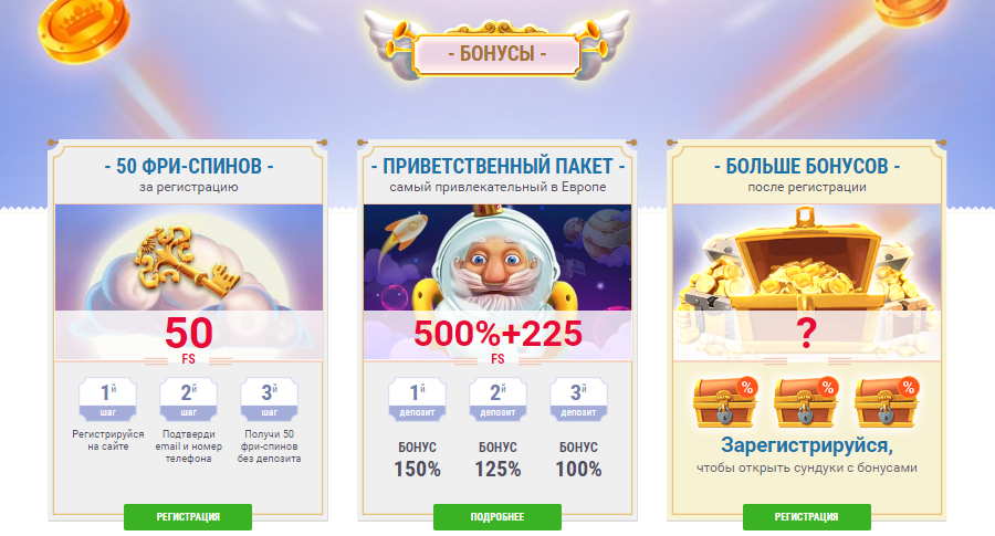 - бездепозитный бонус за регистрацию в виде 50 бесплатных вращений;